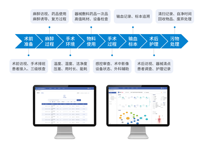 围术期的临床业务数据展示,从进程时间来看分手术前、手术中、手术后,从管理科室看,分手术室、病区、其他协作科室。